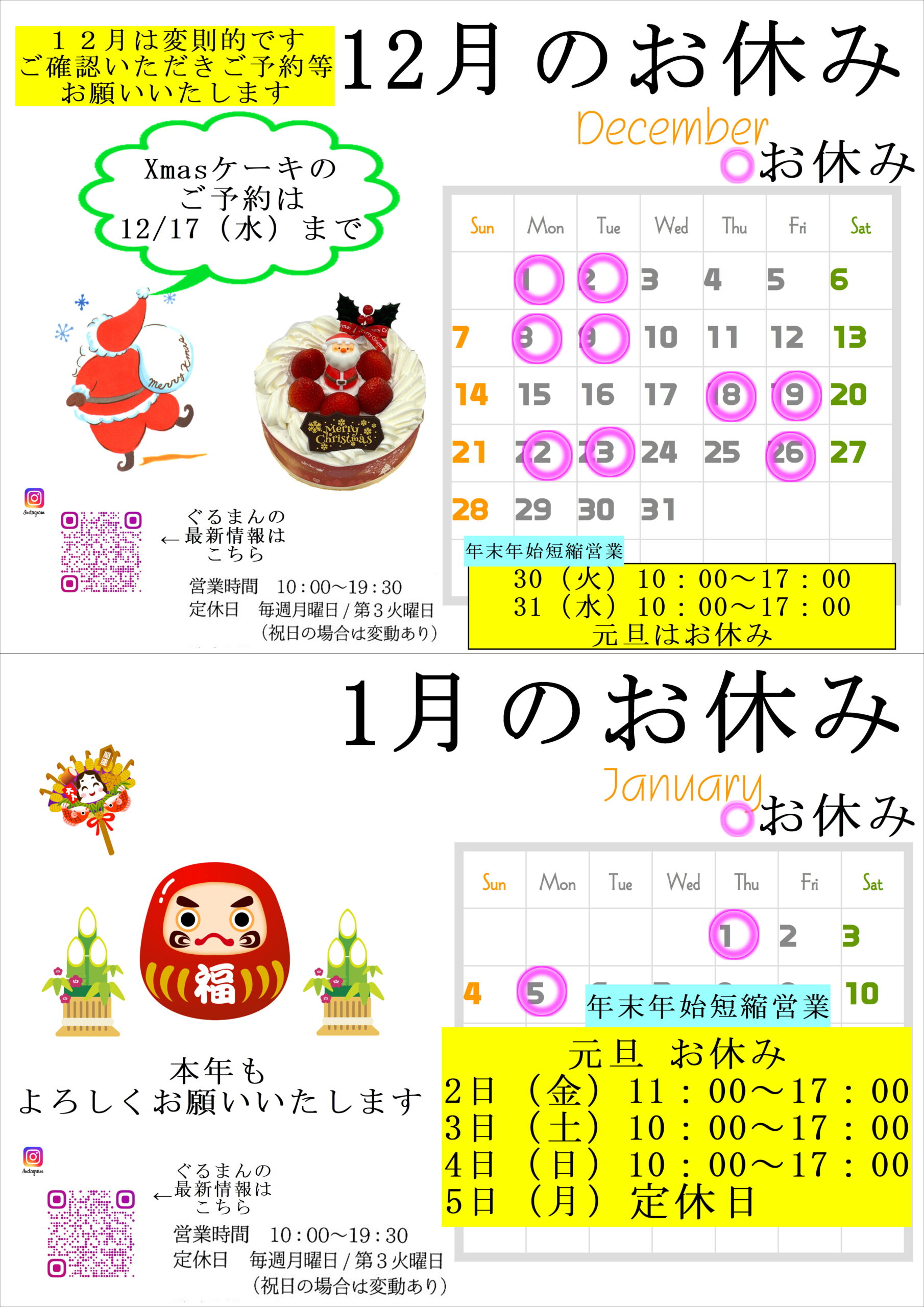 その他は、通常通り月曜・第3火曜がお休みになります。